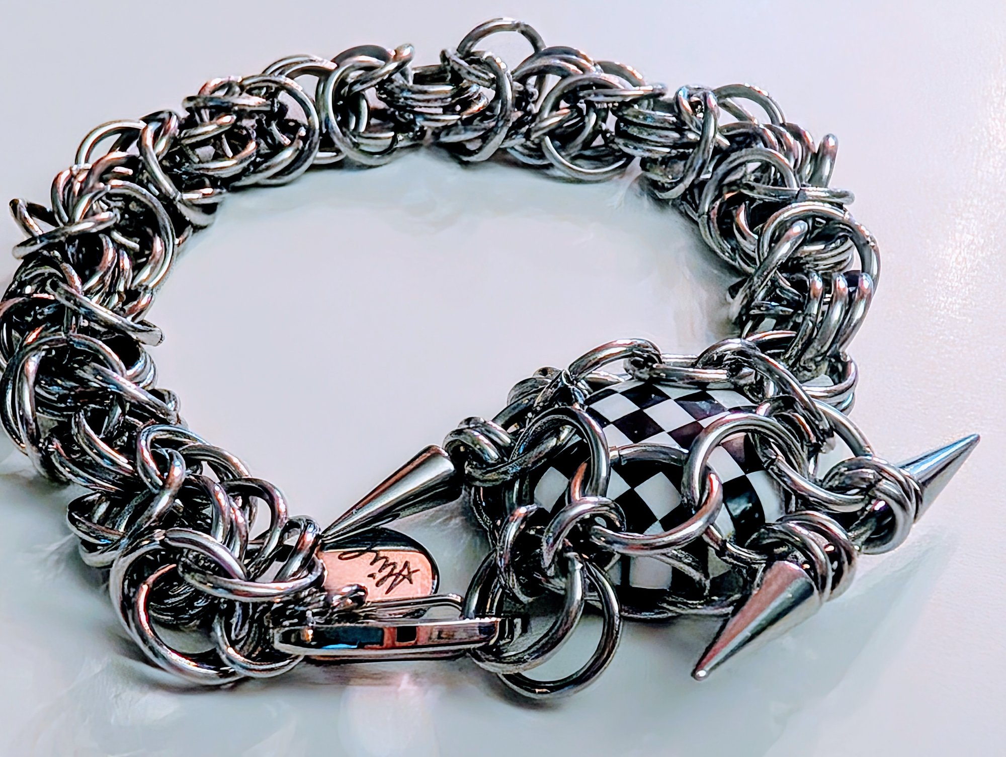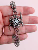 One of a kind solid stainless steel bracelet with black onyx and opal cabachon. Please message me with your wrist size in inches so I can adjust it to fit you.